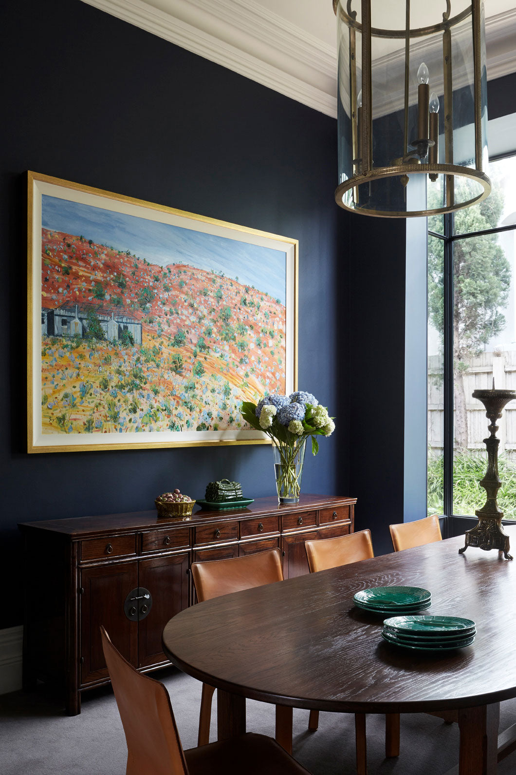 An apple green library extends to views of a lush garden beyond. The dining room has been transformed by removing a modest bay window and adding a steel frame square box bay to emphasise the ceiling height and maximise natural light, walls painted in a rich dark navy adding warmth and a dramatic backdrop for the client’s art collection. The elegant ensuite bathroom features Carrara marble tiles, bench tops contrasting against simple white joinery and polished chrome hardware.