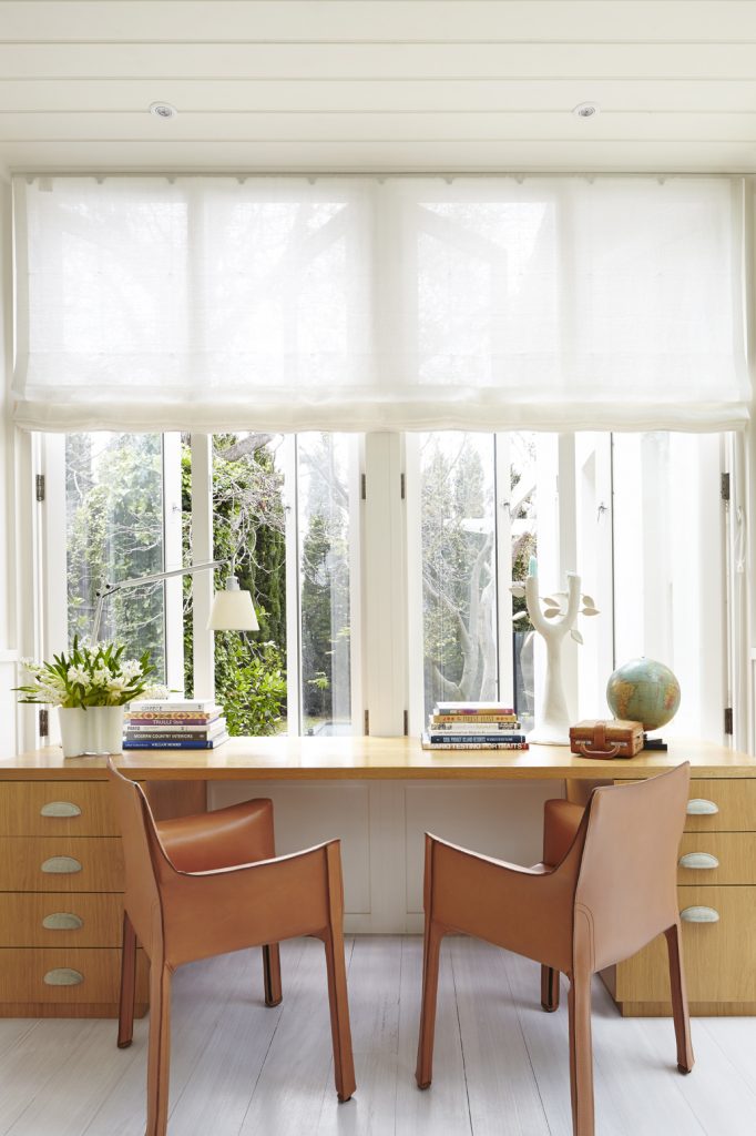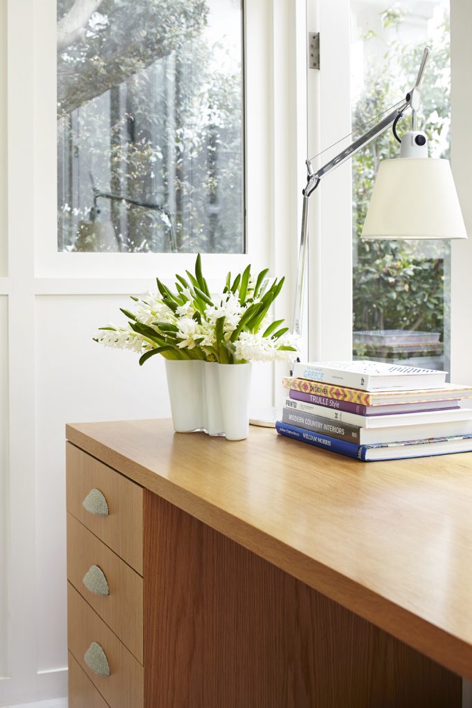 The study has been furnished with our custom designed oak desk with Holland & Sherry wool upholstered cup pulls, bespoke flat weave rug in soft green and beige and a very smart vintage chair in Nympheus printed linen by GP & J Baker, London.The sheer linen soft roman blinds add softness and filter the strong sun on hot days, a perfect spot for our client to work from home or relax with children and dogs.
